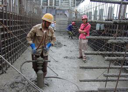 C60高標(biāo)號(hào)混凝土,其粗骨料粒徑30mm以下,級(jí)配合理;砂率39%,中細(xì)砂;以及水泥用量均能達(dá)到泵送要求。但受強(qiáng)度的制約,其水灰比在O.2-0.3之間,致使坍落度為12cm左右,影響混凝土泵送時(shí)的流動(dòng)性,增大了阻力。增加砂率能提高其可泵性,但影響了強(qiáng)度,達(dá)不到設(shè)計(jì)施工要求。因此,解決這一問(wèn)題的唯一途徑就是加減水劑,既不影響強(qiáng)度,又可增大坍落度。開(kāi)始泵送時(shí)未加減水劑,泵送壓力為26-28MPa,泵送速度慢、效果差。如果長(zhǎng)時(shí)間高壓輸送,會(huì)影響混凝土泵的穩(wěn)定性和可靠性。后來(lái)?yè)饺胍欢康臏p水劑(NF-2),坍落度達(dá)到18-20m,泵送壓力明顯下降,僅為18MPa左右,使泵送工效提高約一倍。另外,在泵送過(guò)程中,還應(yīng)提醒操作人員:料斗內(nèi)的混凝土務(wù)必在攪拌軸中線以上,否則會(huì)導(dǎo)致吸空造成混凝土四處飛濺傷人,或由于吸空、氣體壓縮而造成堵管。