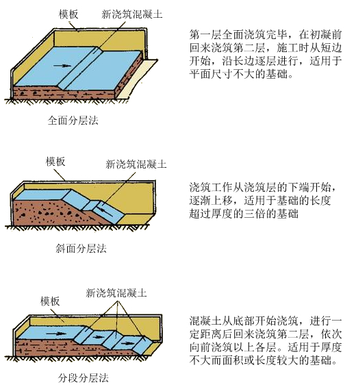 另外,我們在進(jìn)行分層澆筑時還可視情況采用不同的分層澆筑方式進(jìn)行: