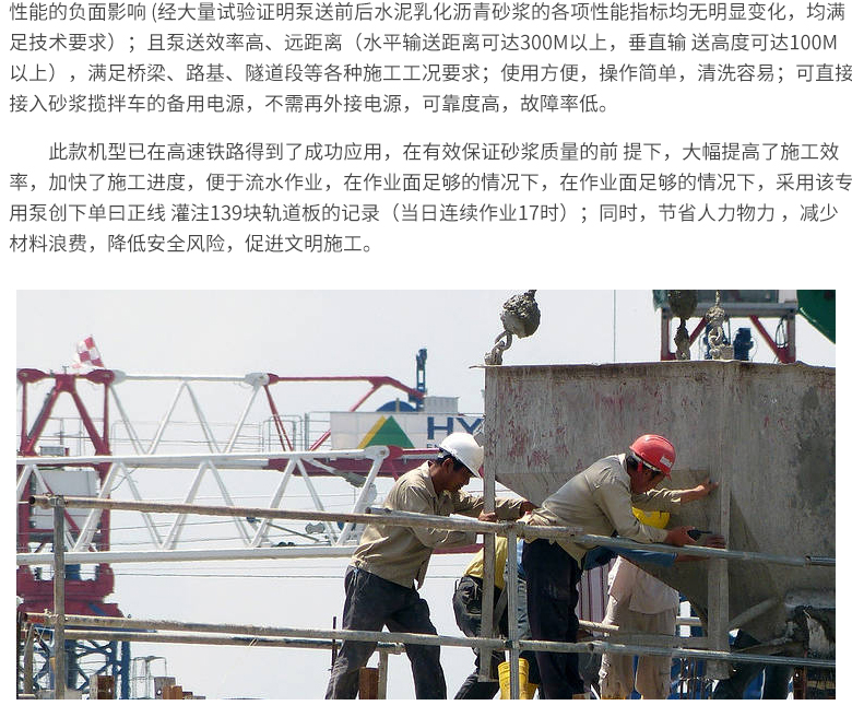簡介:水泥乳化瀝青砂漿專用泵是三民重科根據(jù)高速鐵路板式無砟軌道水泥乳化瀝青砂漿的性能特點與施工要求,經(jīng)過前期廣泛論證、現(xiàn)場充分試驗、后期不斷優(yōu)化而聯(lián)合開發(fā)的并于施工現(xiàn)場成功應的專用泵送設備。